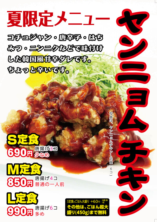 9月までの限定メニュー〔ヤンニョムチキン〕は終売となりました。