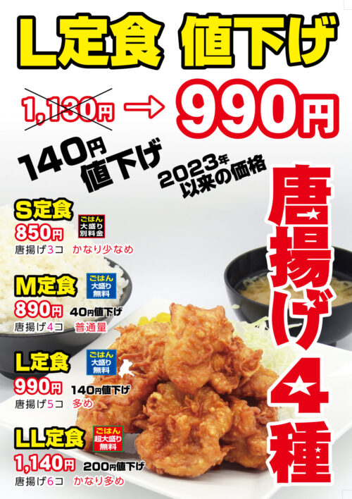 唐揚げ定食各種を値下げしました