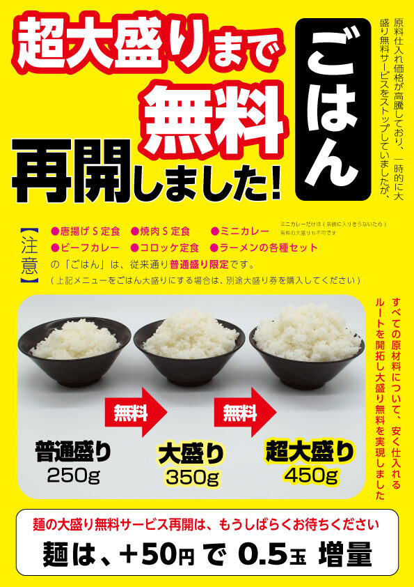 様々な原材料の高騰のあおりを受け、先月から「ごはん超大盛り無料サービス」をストップしていましたが、本部の管理経費を含めすべての経費を見直し、ごはんを無料で大盛りにできるぐらい経費を圧縮できましたので、8/20(土)より「ごはん超大盛り無料サービス」を再開致します。