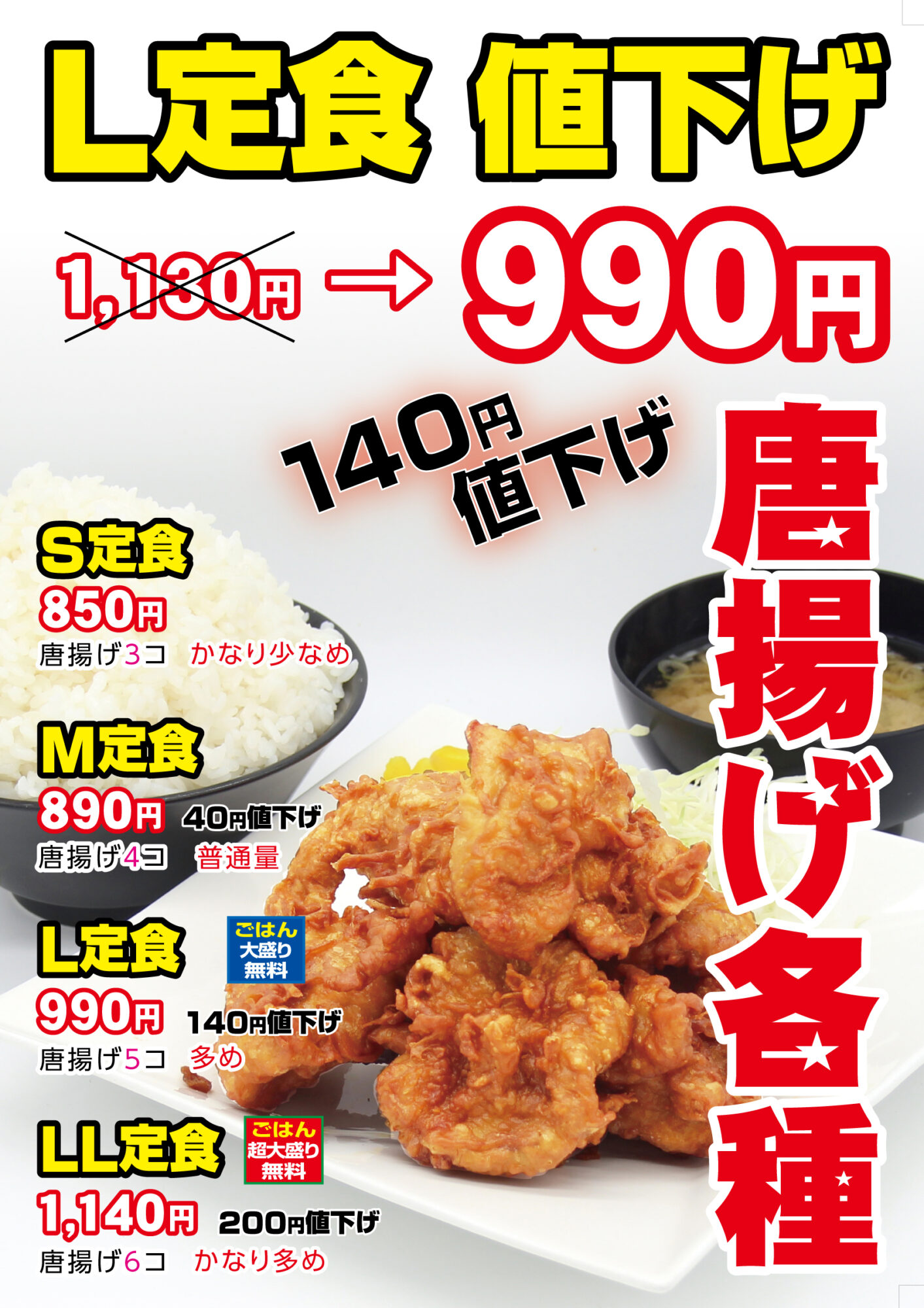 そんな爆量を〈唐揚げLL定食〉〈焼肉L定食〉を注文されたお客様に限り、追加料金無しで提供しています。