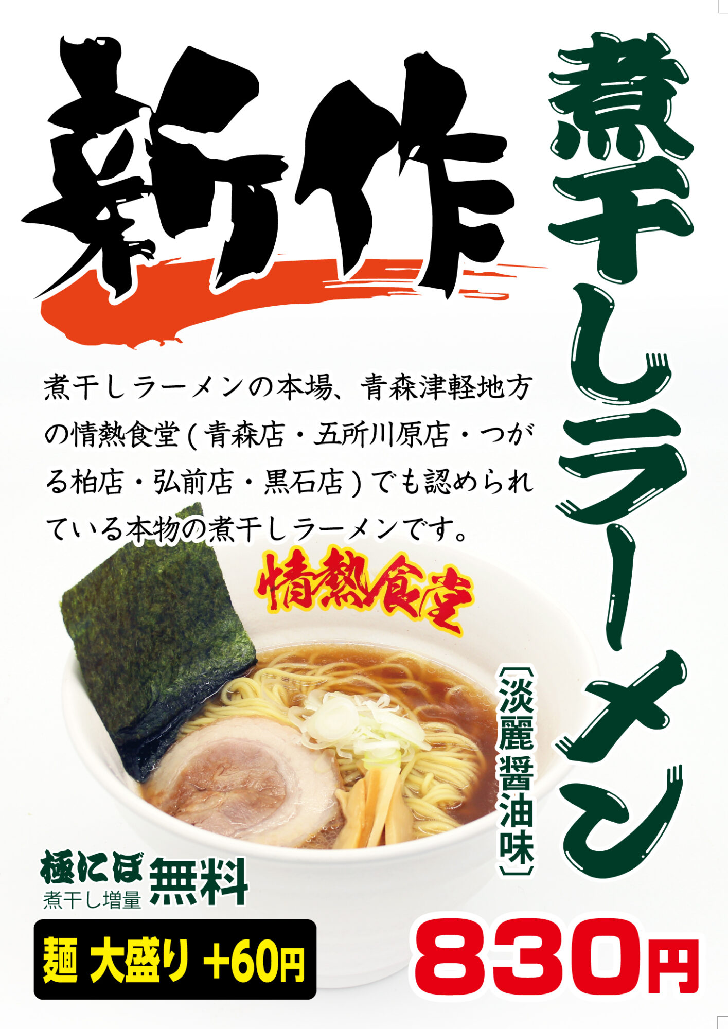 青森県津軽地方の情熱食堂各店でも人気の「煮干しラーメン」を、全国の情熱食堂で発売開始しました。