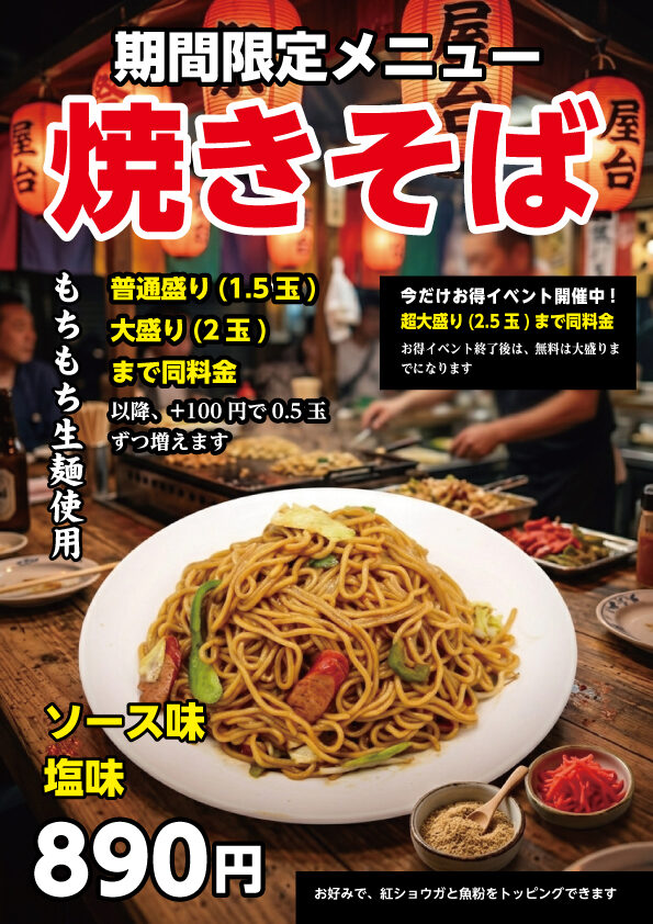 情熱食堂では、4/16(木)に〔焼きそば〕を販売開始しました